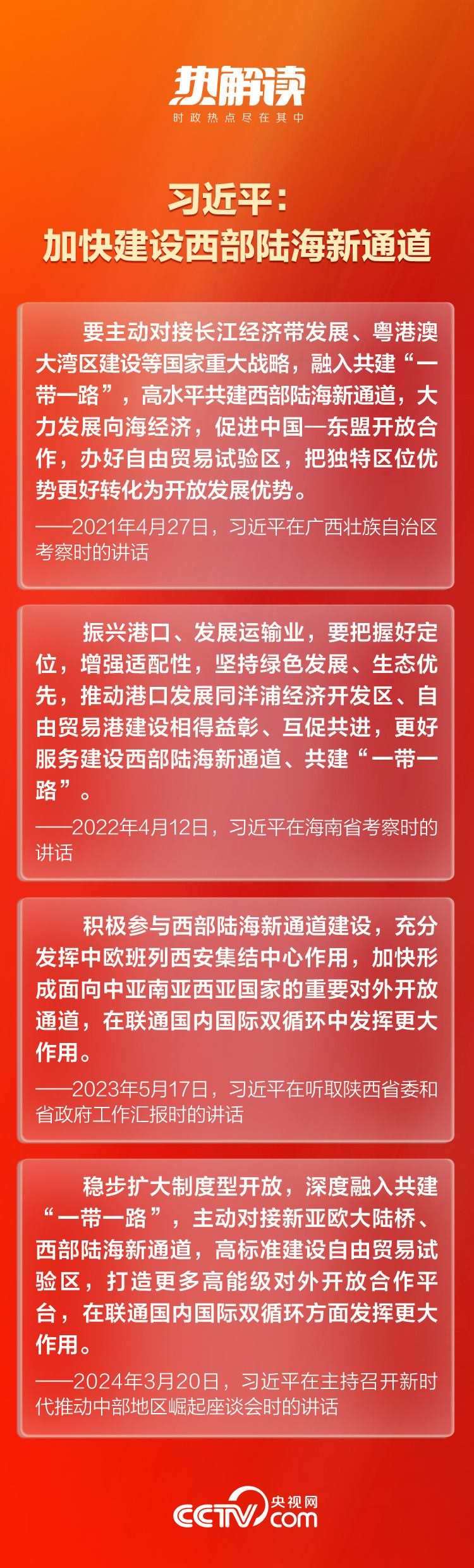 總書記一直對這條通道的建設十分關(guān)切。近年來,總書記在貴州、陜西、廣西等西部陸海新通道沿線省區(qū)考察時,多次對高水平共建西部陸海新通道作出重要指示。