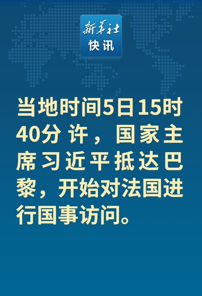 新華社快訊:當(dāng)?shù)貢r(shí)間5日15時(shí)40分許,國(guó)家主席習(xí)近平抵達(dá)巴黎,開始對(duì)法國(guó)進(jìn)行國(guó)事訪問。