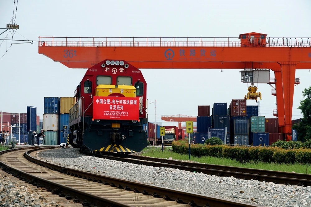 2022年7月29日,合肥至匈牙利布達佩斯的中歐班列從合肥北站物流基地駛出,標志著合肥中歐班列通往匈牙利布達佩斯的線路正式開通。新華社發(fā)(席靜玉 攝)