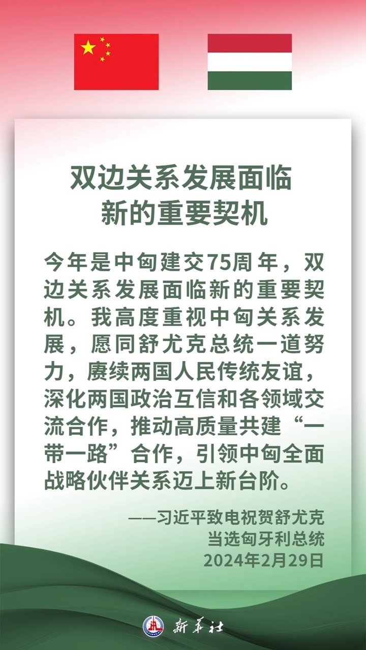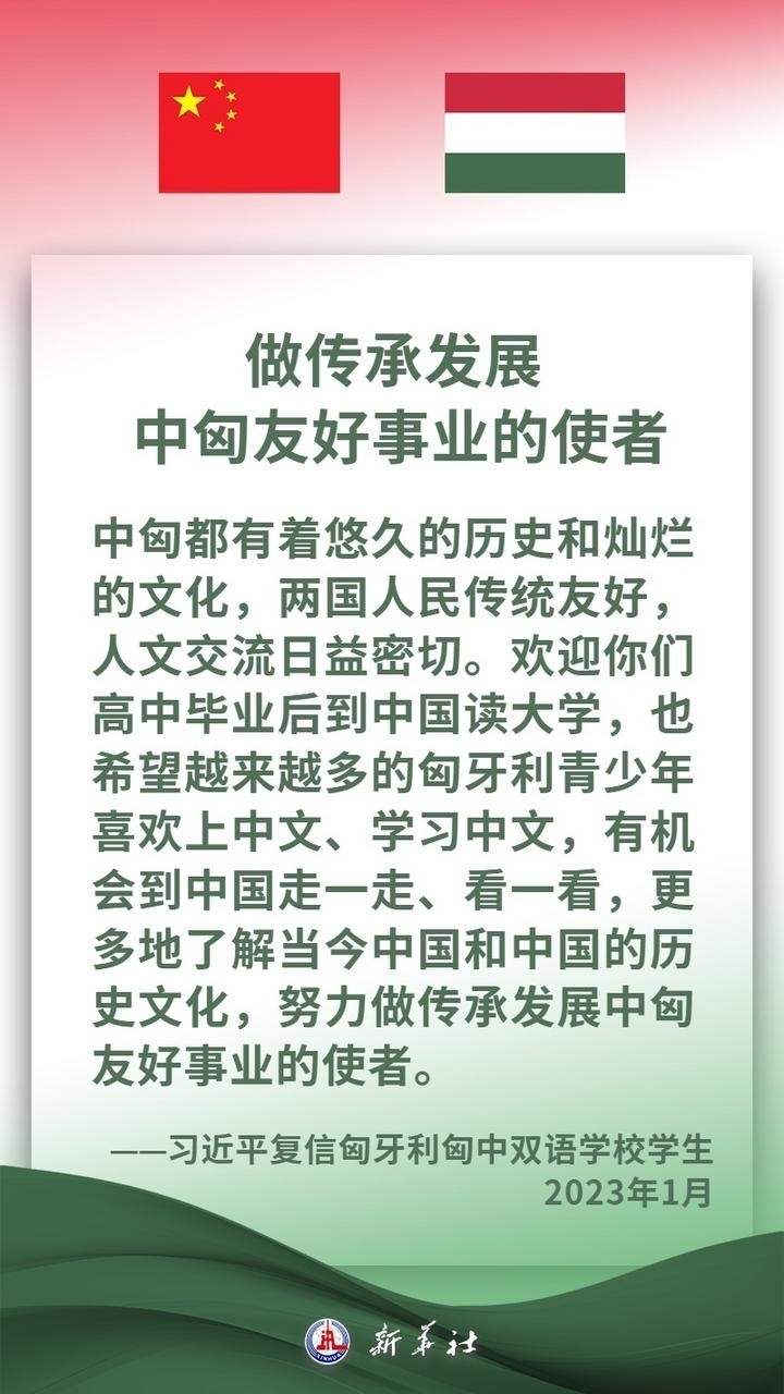 匈牙利是中東歐地區(qū)重要國家,是中方推進共建“一帶一路”及中國-中東歐國家合作的重要合作伙伴。近年來,在兩國領導人的戰(zhàn)略引領下,中匈關系保持高水平發(fā)展,兩國高層交往密切,政治互信持續(xù)深化,各領域合作扎實推進、成果豐碩,為兩國人民帶來切實利益。習近平主席說,中方愿同匈方繼續(xù)做彼此信賴、合作共贏的好朋友、好伙伴。