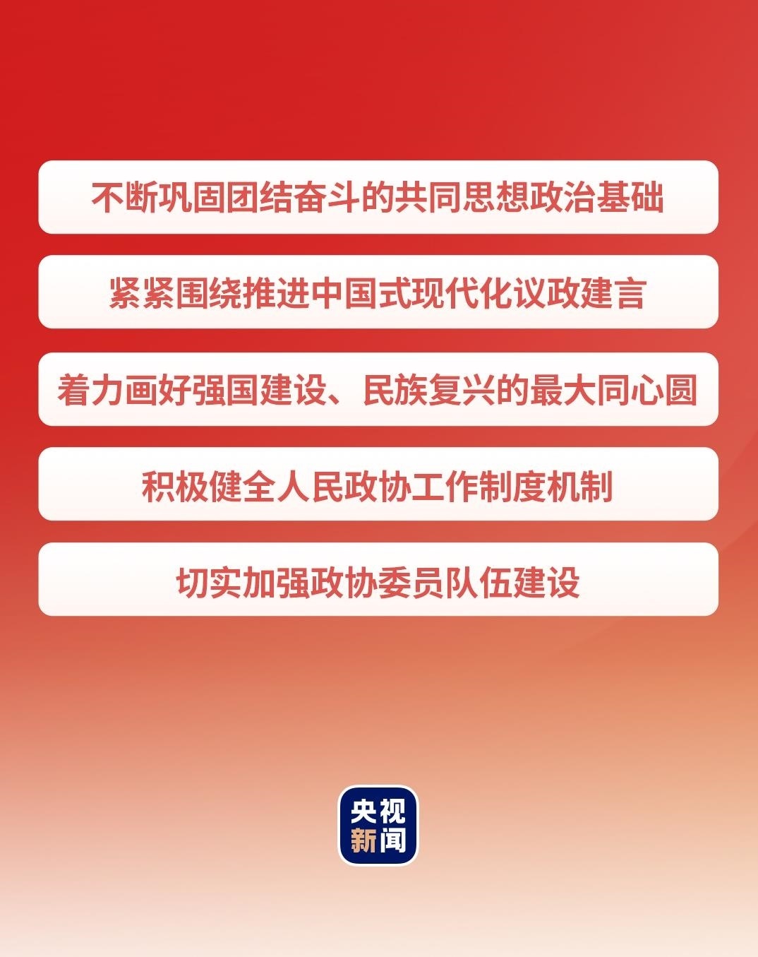 在這次慶祝大會(huì)上,習(xí)近平總書(shū)記從5個(gè)方面提出要求,寄望人民政協(xié)發(fā)揚(yáng)優(yōu)良傳統(tǒng),牢記政治責(zé)任,堅(jiān)持黨的領(lǐng)導(dǎo)、統(tǒng)一戰(zhàn)線、協(xié)商民主有機(jī)結(jié)合,充分發(fā)揮專門協(xié)商機(jī)構(gòu)作用,為推進(jìn)中國(guó)式現(xiàn)代化廣泛凝聚人心、凝聚共識(shí)、凝聚智慧、凝聚力量。