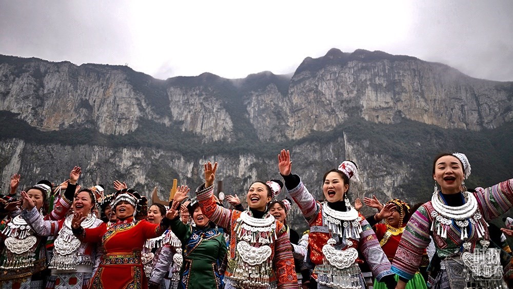△2021年2月,習(xí)近平總書記來到貴州化屋村考察,當(dāng)?shù)卮迕裼脷g快的苗家歌舞迎接總書記。(總臺央視記者王哈男拍攝)