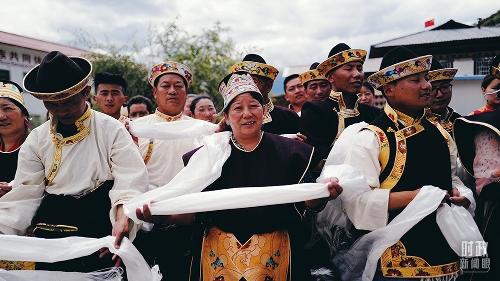 △2021年7月,習(xí)近平總書記來到西藏林芝市嘎拉村考察。村民們手捧哈達,熱情迎接。(總臺央視記者彭漢明拍攝)