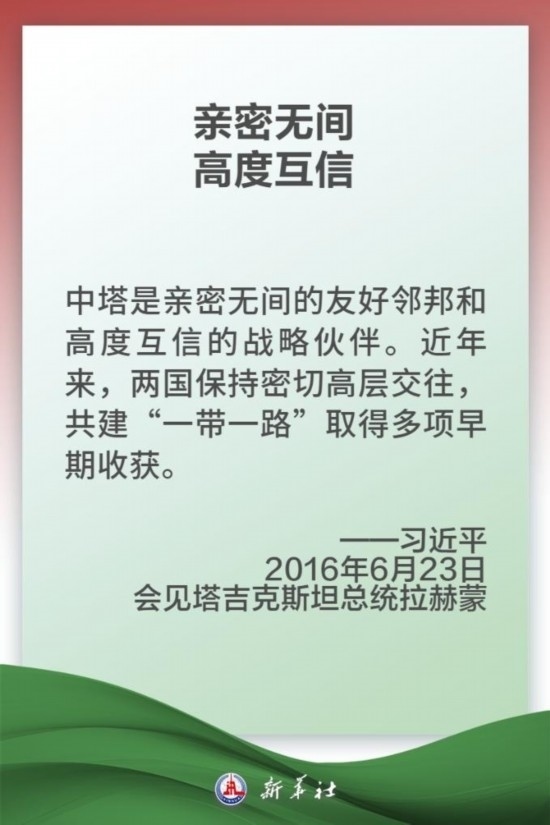 中國(guó)和塔吉克斯坦山水相連,兩國(guó)人民友好交往源遠(yuǎn)流長(zhǎng)。中塔建交30年多來,兩國(guó)關(guān)系取得跨越式發(fā)展,達(dá)到全面戰(zhàn)略伙伴關(guān)系的歷史性高度。塔方最早同中方簽署共建“一帶一路”合作倡議,雙方率先建立發(fā)展共同體和安全共同體。