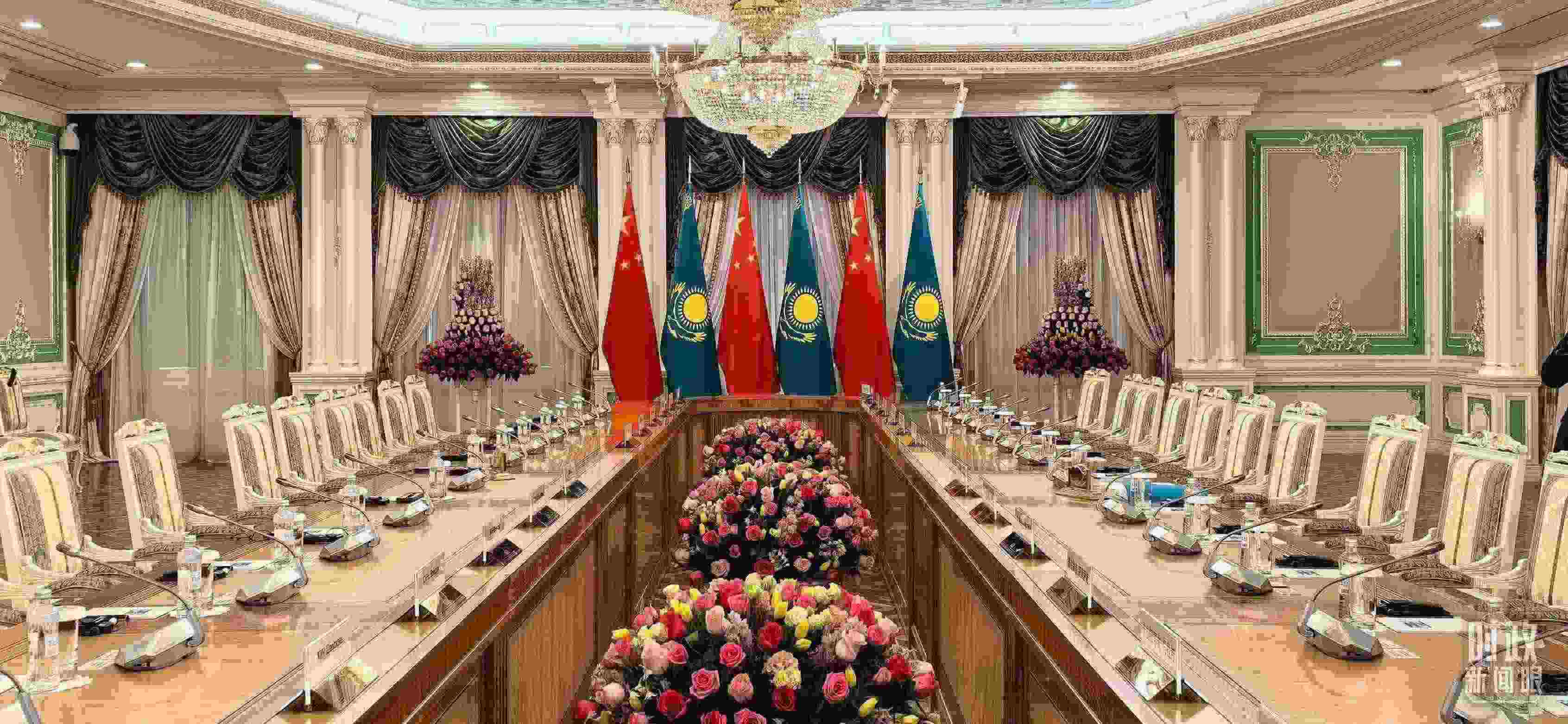 △中哈元首小范圍會(huì)談開始前的現(xiàn)場。(總臺(tái)央視記者劉岳拍攝)