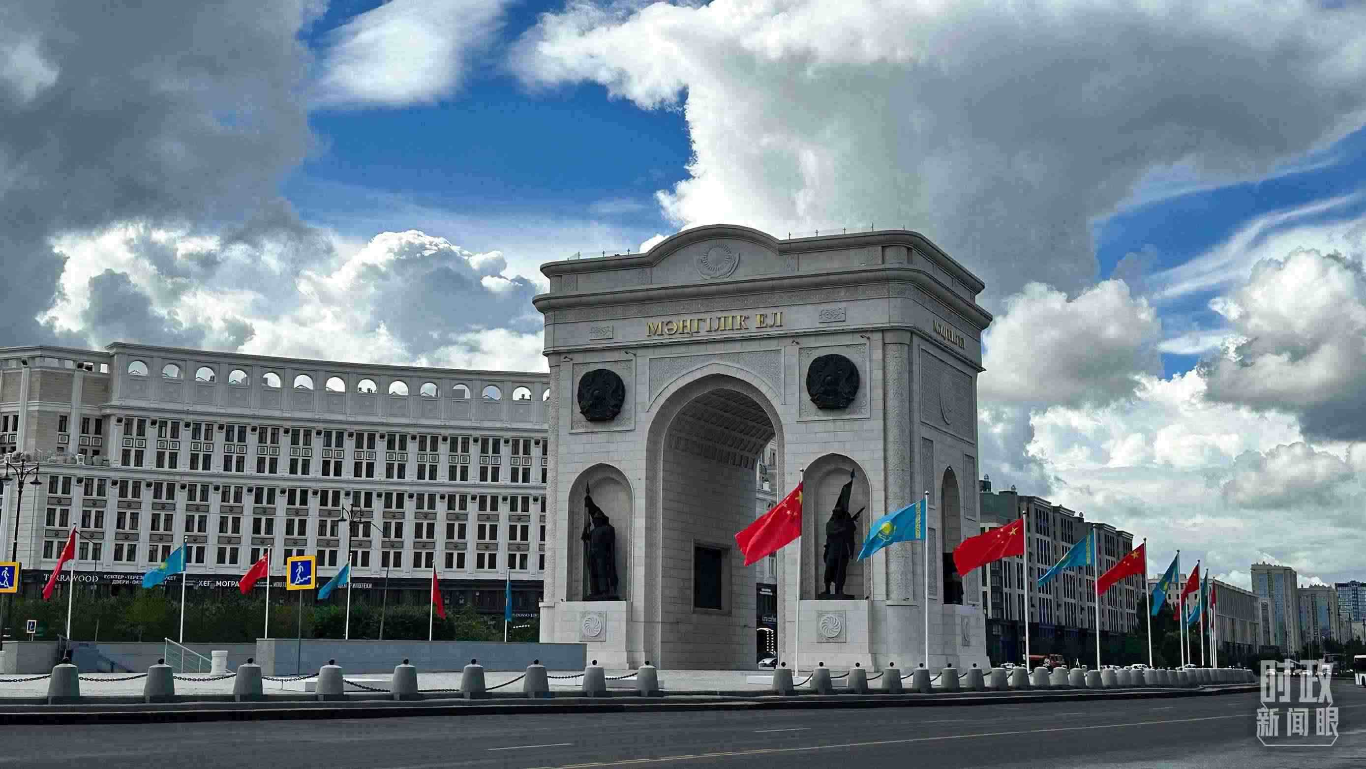 △阿斯塔納地標(biāo)建筑“凱旋門”兩側(cè),中哈兩國國旗迎風(fēng)招展。(總臺(tái)央視記者關(guān)舟拍攝)