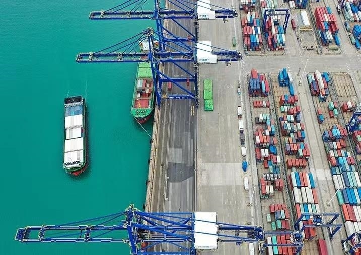△集裝箱貨輪在海南洋浦國際集裝箱碼頭裝卸貨物。
