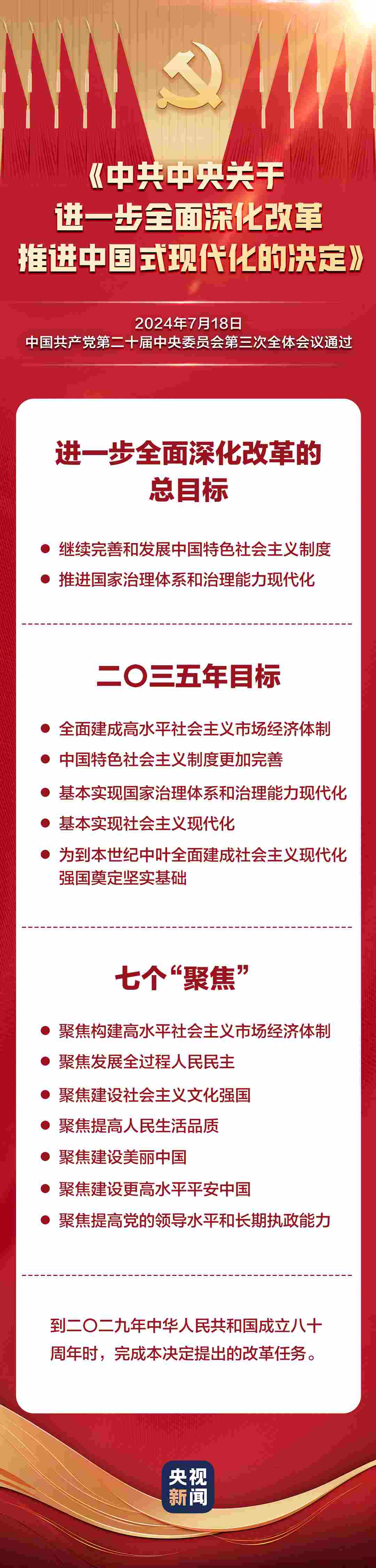 中國共產(chǎn)黨第二十屆中央委員會第三次全體會議,于2024年7月15日至18日在北京舉行。全會最重要的成果是審議通過《中共中央關(guān)于進一步全面深化改革、推進中國式現(xiàn)代化的決定》。《決定》共15部分、60條,分三大板塊,一文速覽: