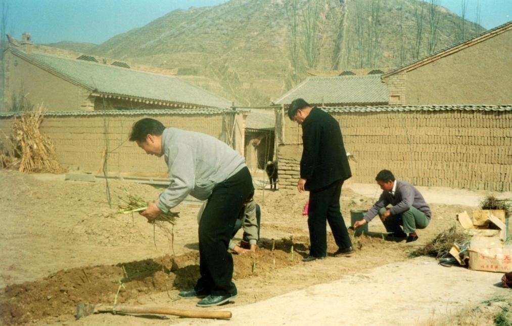 1997年4月,林占熺(左一)帶領(lǐng)科研團(tuán)隊(duì)首次在寧夏彭陽縣試種菌草。新華社發(fā)