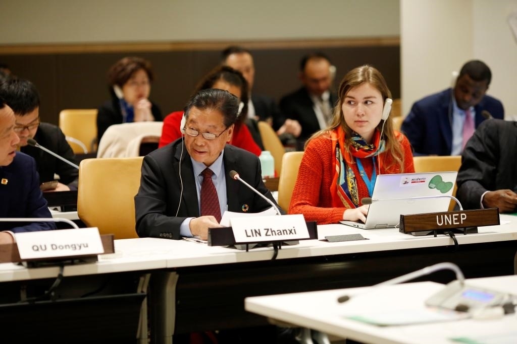 2019年4月18日,在位于紐約的聯(lián)合國總部,林占熺(前排中)在“菌草技術(shù):‘一帶一路’倡議對促進(jìn)落實(shí)聯(lián)合國2030年可持續(xù)發(fā)展議程的實(shí)質(zhì)性貢獻(xiàn)”專題研討會上發(fā)言。新華社記者 李木子 攝