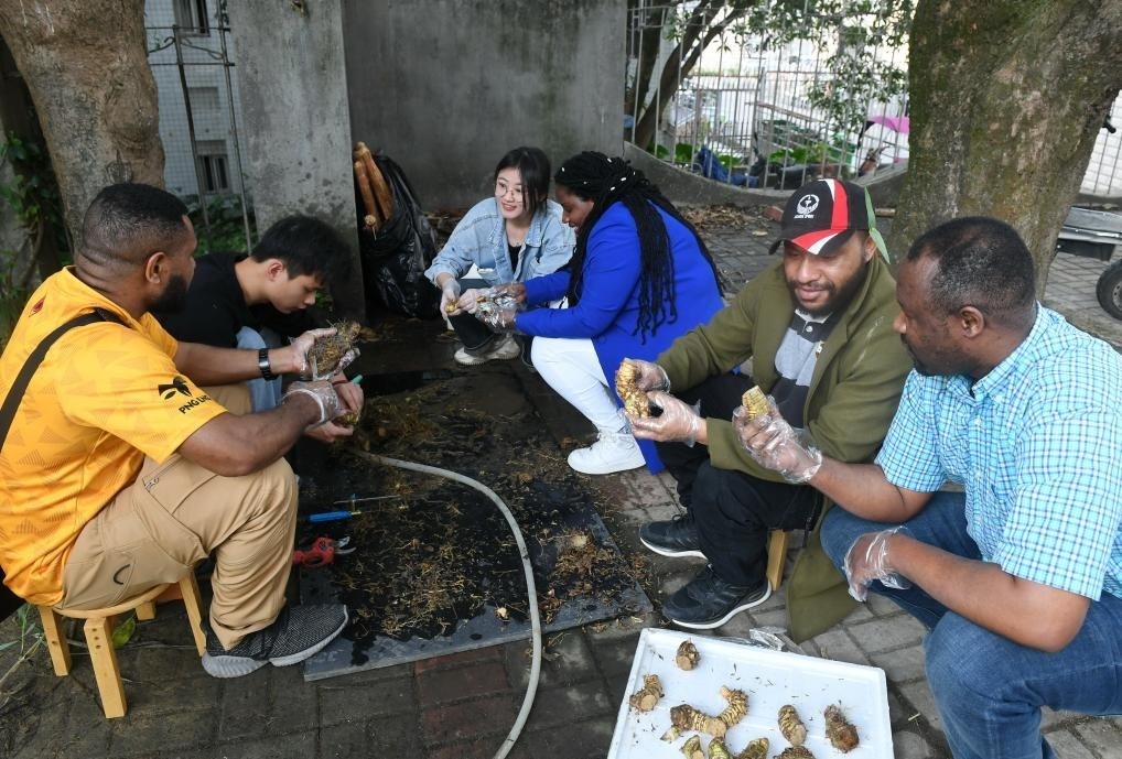 3月28日,在位于福州的福建農(nóng)林大學(xué),來自盧旺達(dá)和巴布亞新幾內(nèi)亞的學(xué)生與菌草專業(yè)學(xué)生交流。新華社記者 林善傳 攝