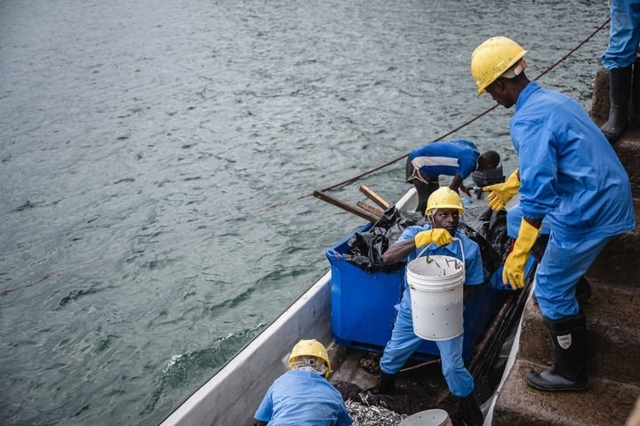 工作人員在肯尼亞夸萊郡希莫尼鎮(zhèn)一處港口搬運新捕撈的鳀魚(2023年6月22日攝)。新華社記者 王冠森 攝