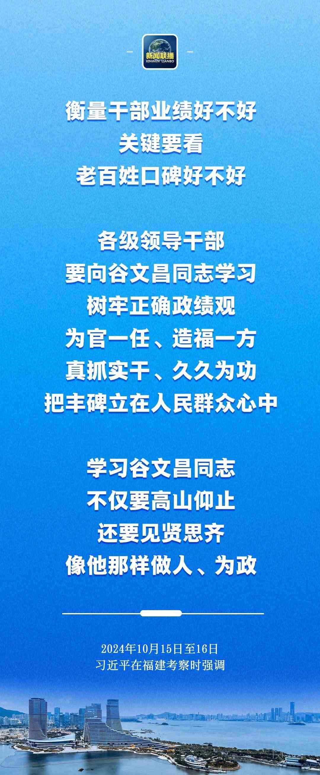 習近平在谷文昌紀念館考察時指出,衡量干部業(yè)績好不好,關鍵要看老百姓口碑好不好。各級領導干部要向谷文昌同志學習,樹牢正確政績觀,為官一任、造福一方,真抓實干、久久為功,把豐碑立在人民群眾心中。學習谷文昌同志,不僅要高山仰止,還要見賢思齊,像他那樣做人、為政。