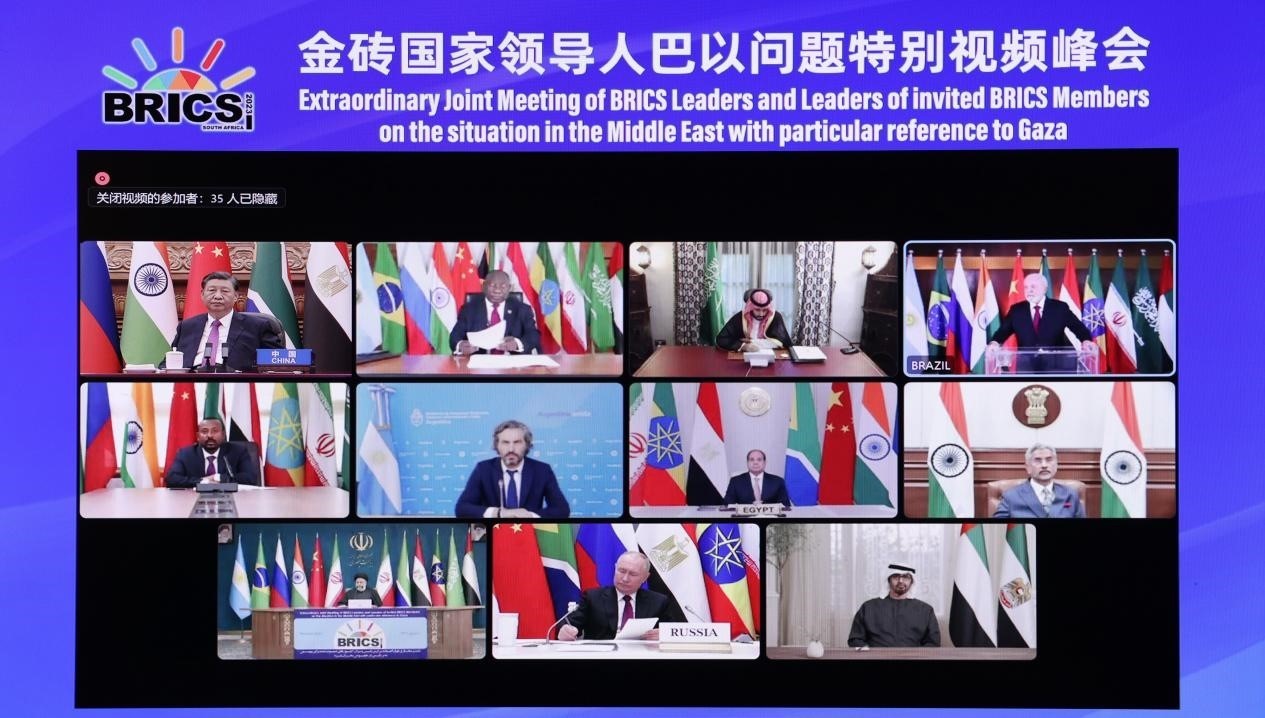 金磚國家始終是國際公平正義的堅定守護者。2023年11月21日,習近平主席在北京出席金磚國家領導人巴以問題特別視頻峰會并提出三點正義主張。