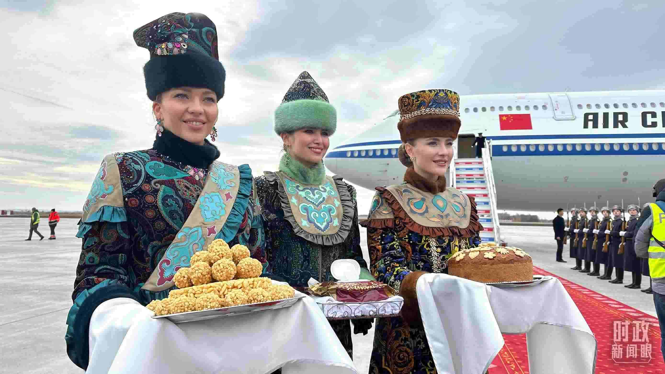 △ 習(xí)主席專機(jī)抵達(dá)喀山國(guó)際機(jī)場(chǎng)時(shí),禮兵在紅毯兩側(cè)列隊(duì)致敬,身著民族服裝的俄羅斯女青年用傳統(tǒng)禮節(jié)表示歡迎。(總臺(tái)央視記者盧心雨拍攝)