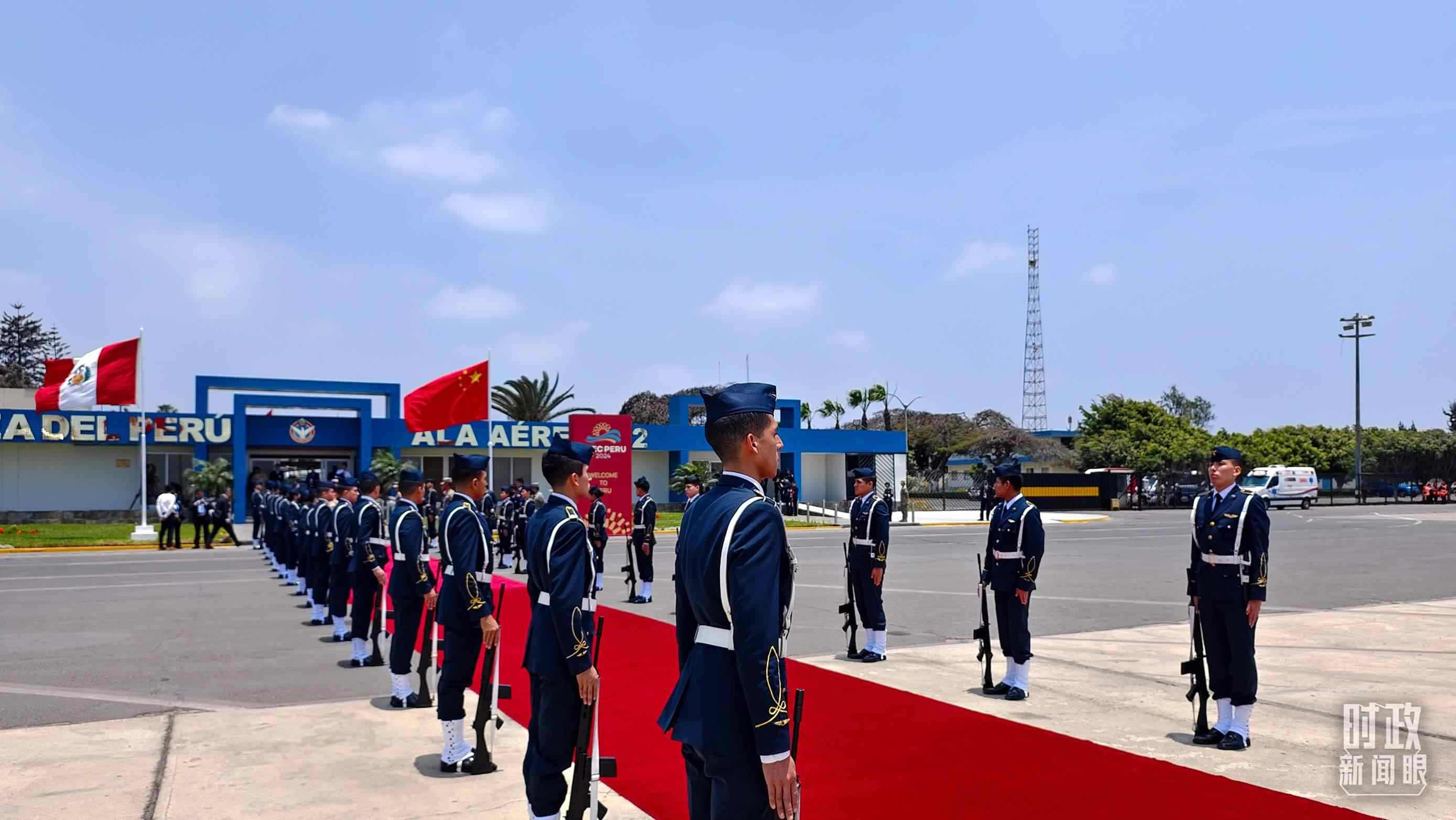 △利馬空軍基地,秘魯禮兵分列紅毯兩側(cè)迎接習(xí)主席到訪。(總臺央視記者韓銳拍攝)
