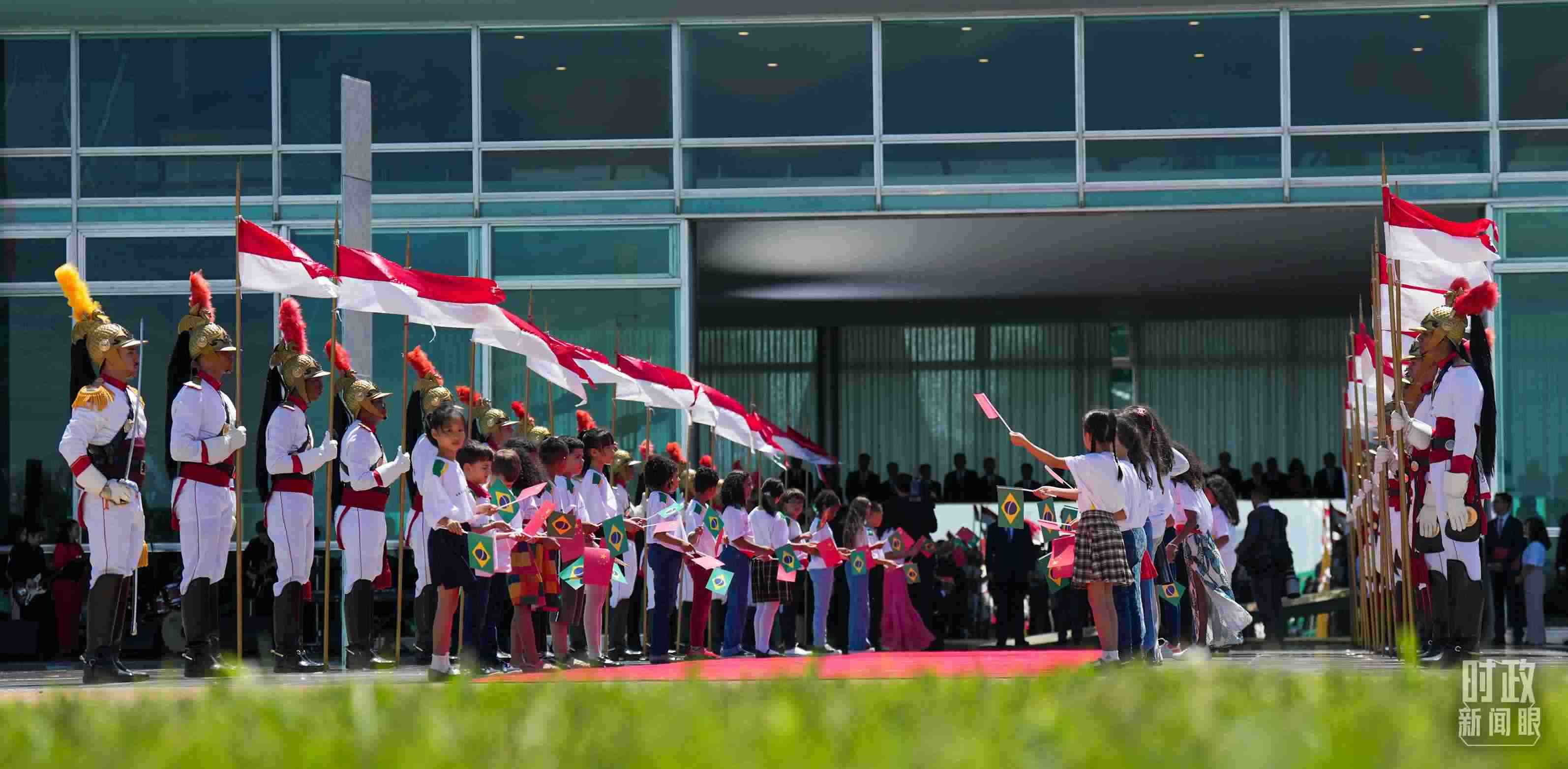 儀式現(xiàn)場,中國和巴西兩國兒童揮舞國旗熱烈歡迎習(xí)主席。