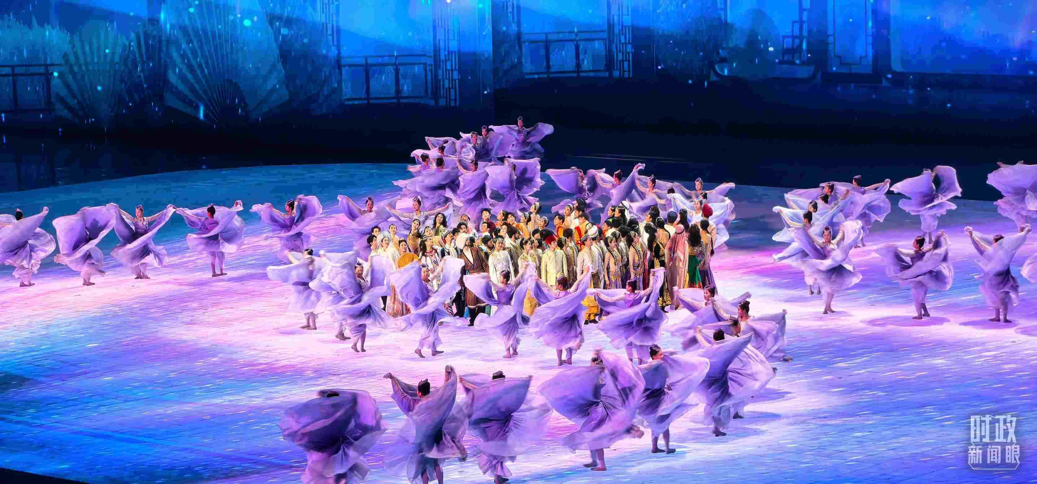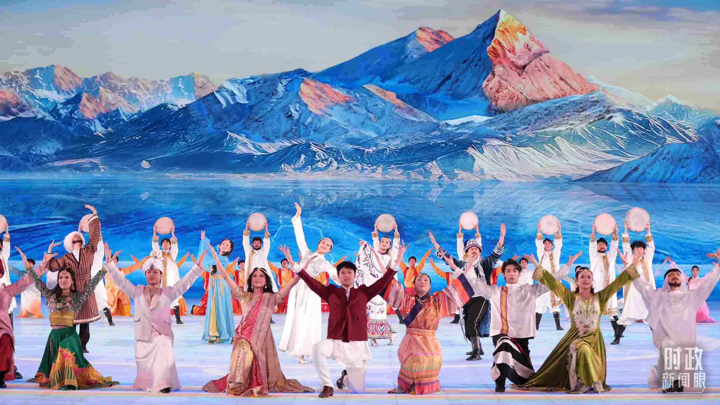 文藝表演分為上篇《熾熱冰雪》、中篇《燃情時(shí)速》、下篇《山高水長(zhǎng)》,通過《長(zhǎng)歌頌冰河》《榮光耀未來》《馳騁天地間》《璀璨嘉年華》《攜手情久長(zhǎng)》《萬里共和鳴》等節(jié)目,展現(xiàn)化“極寒”為“極美”“極燃”“極暖”的意蘊(yùn)。