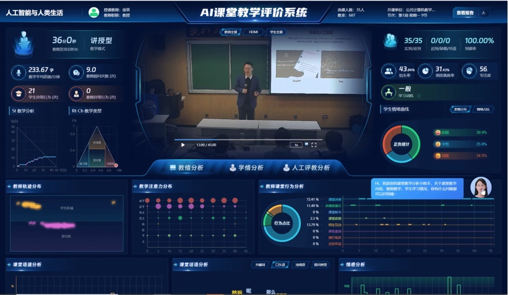 “您講授的‘人工智能與人類生活’課程質(zhì)量很高,但您的口頭語比較頻繁……”報(bào)告共有教學(xué)內(nèi)容、教學(xué)方法、師生行為等28項(xiàng)指標(biāo),還會(huì)針對(duì)提升教學(xué)質(zhì)量給出合理建議。