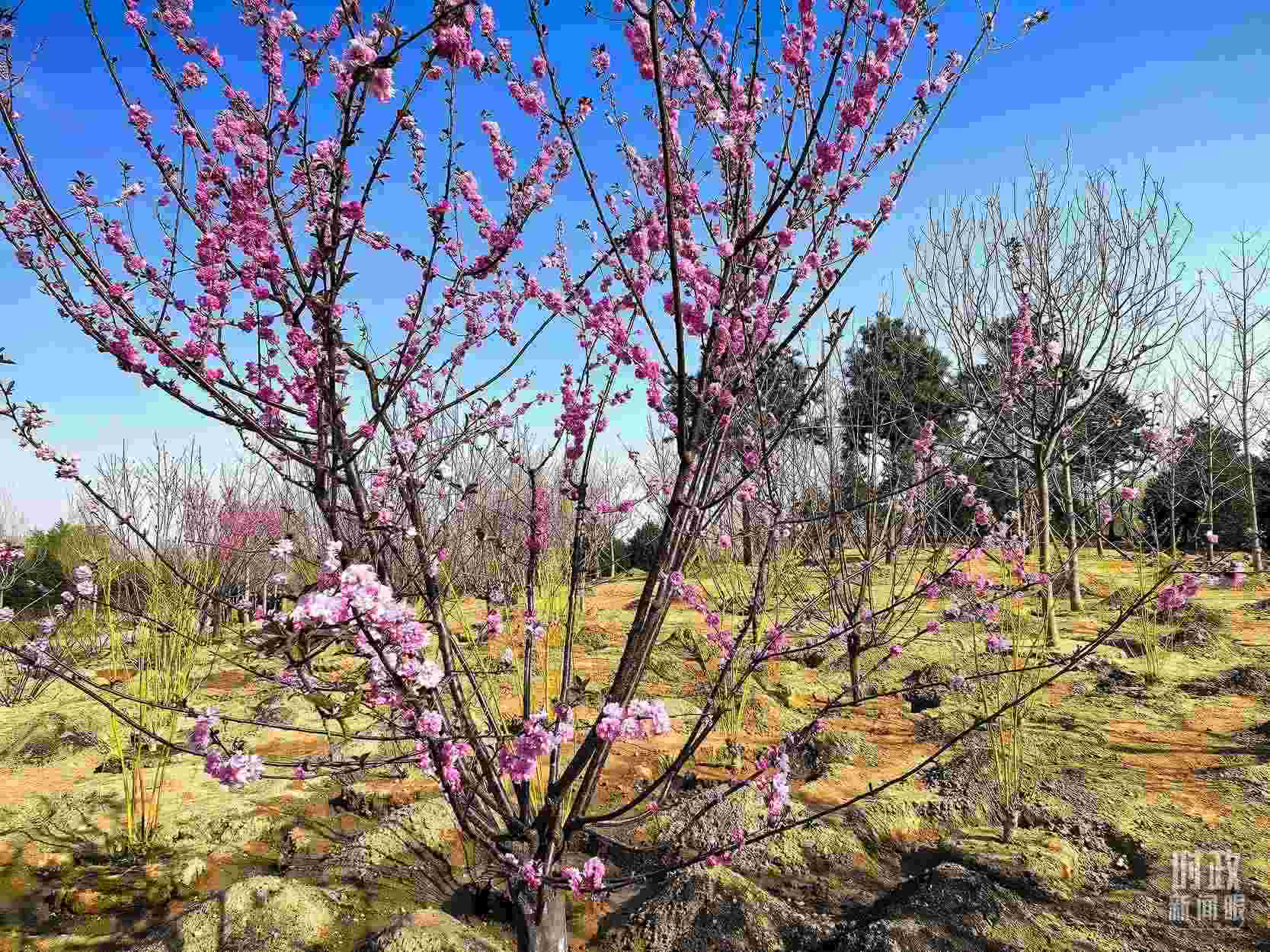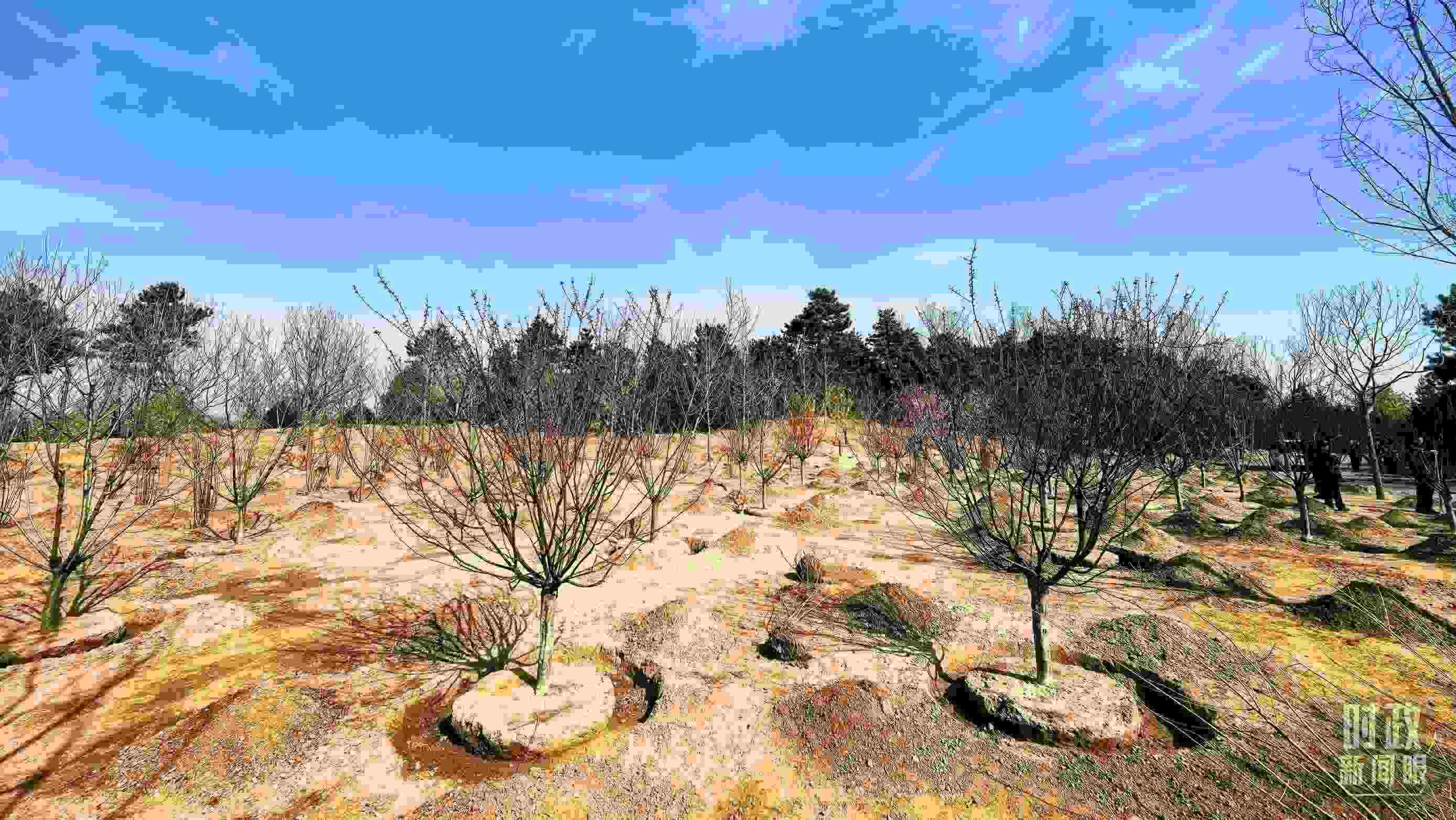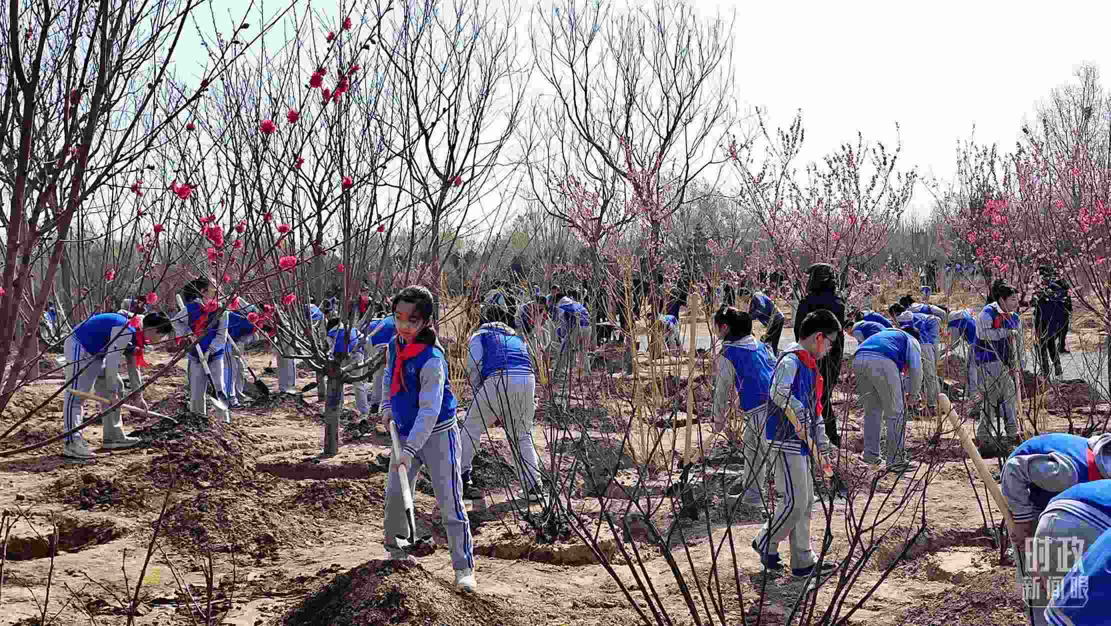 △永定河畔植樹點(diǎn),春意上枝頭。(總臺央視記者胡瑋、程鋮拍攝)