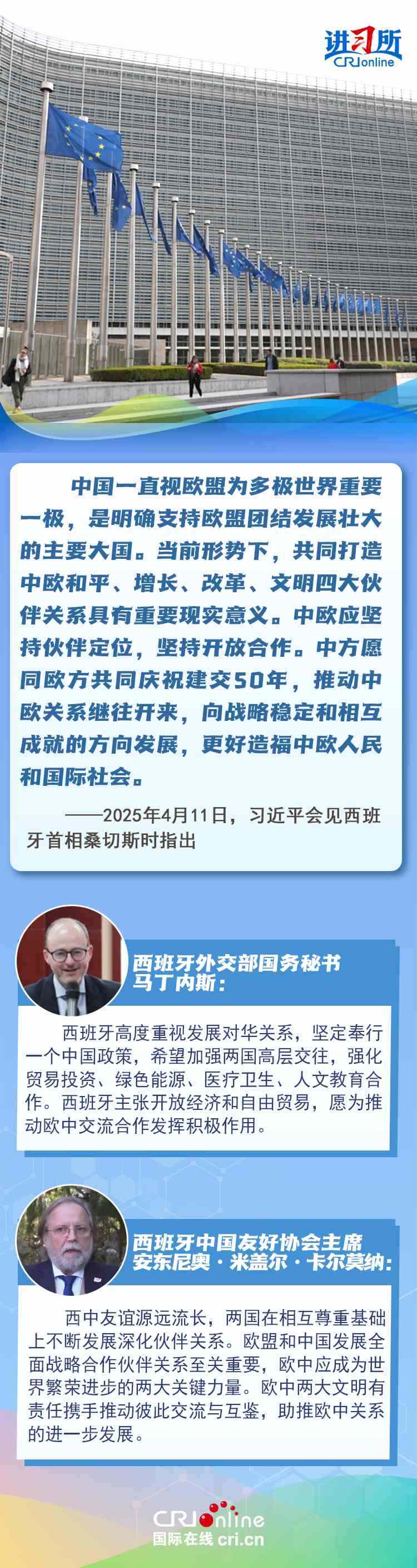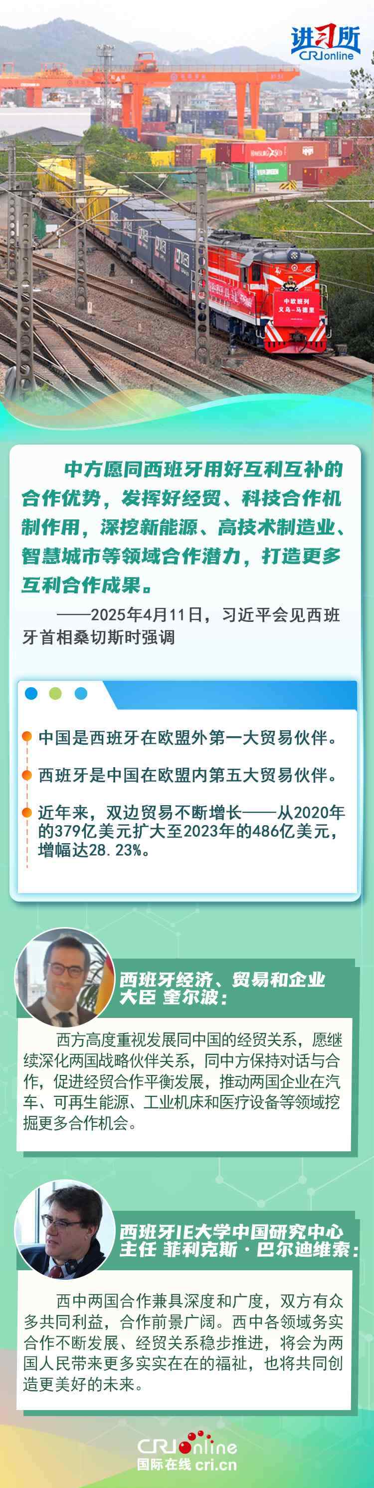今年是中西全面戰(zhàn)略伙伴關(guān)系建立20周年,也是中歐建交50周年。多年來(lái),中西兩國(guó)領(lǐng)導(dǎo)人保持密切互動(dòng),秉持互尊互信、互利共贏精神,兩國(guó)在深化貿(mào)易、投資、科技創(chuàng)新、綠色能源等領(lǐng)域取得豐富合作成果,雙邊關(guān)系走在中國(guó)同歐洲國(guó)家關(guān)系前列。在西班牙人士眼中,良好的對(duì)華關(guān)系對(duì)西班牙、歐洲和世界具有重要意義,將會(huì)為兩國(guó)人民帶來(lái)更多實(shí)實(shí)在在的福祉,也將共同創(chuàng)造更美好的未來(lái)。