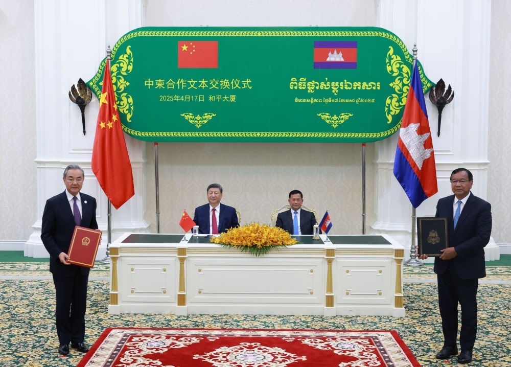 產(chǎn)供鏈合作、人工智能合作、發(fā)展援助合作、海關(guān)檢驗(yàn)檢疫合作……雙方代表一次次走上大廳中央的紅色方毯,交換合作文本。深化更高水平政治互信、拓展更高質(zhì)量互利合作、筑牢更高層次安全保障、開展更高頻率人文交流、強(qiáng)化更高標(biāo)準(zhǔn)戰(zhàn)略協(xié)作,從五大領(lǐng)域發(fā)力,中柬關(guān)系向更高水平邁進(jìn)。