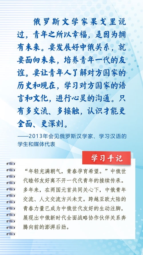 中華民族和俄羅斯民族都有悠久的歷史、古老的文明、燦爛的文化,都是偉大的民族。近年來(lái),習(xí)近平主席常常引用中國(guó)詩(shī)詞古語(yǔ)、俄羅斯諺語(yǔ)名言等,寄語(yǔ)中俄關(guān)系發(fā)展和全人類和平與發(fā)展。這些重要論述,蘊(yùn)含對(duì)文明、歷史的深邃思考,指引著新時(shí)代的中俄關(guān)系不斷向前,為世界百年變局中的人類文明進(jìn)步事業(yè)指明方向。