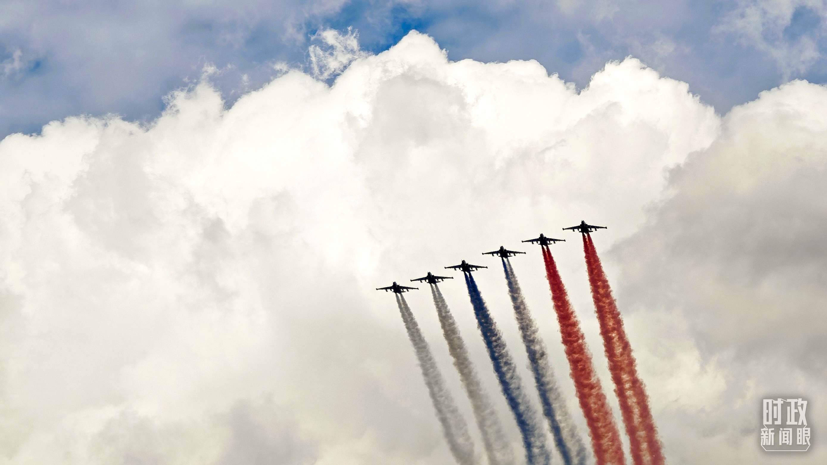 △5月7日,參加紀(jì)念蘇聯(lián)偉大衛(wèi)國(guó)戰(zhàn)爭(zhēng)勝利80周年慶典彩排的空中飛行梯隊(duì)飛越紅場(chǎng)。(總臺(tái)央視記者王哈男拍攝)