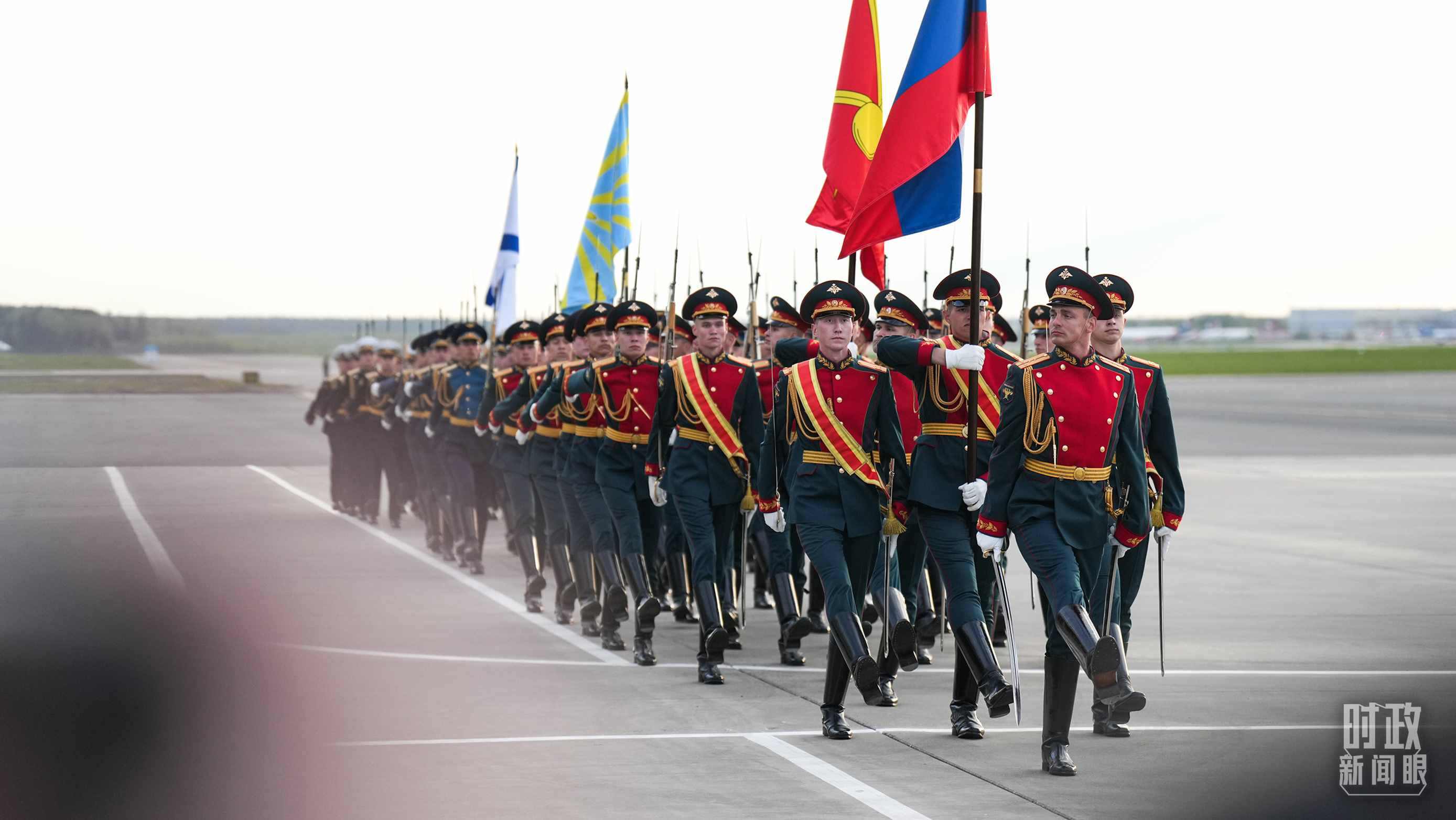 俄方在機(jī)場(chǎng)舉行隆重迎接儀式。軍樂團(tuán)奏中俄兩國(guó)國(guó)歌。習(xí)主席檢閱儀仗隊(duì)并觀看分列式。