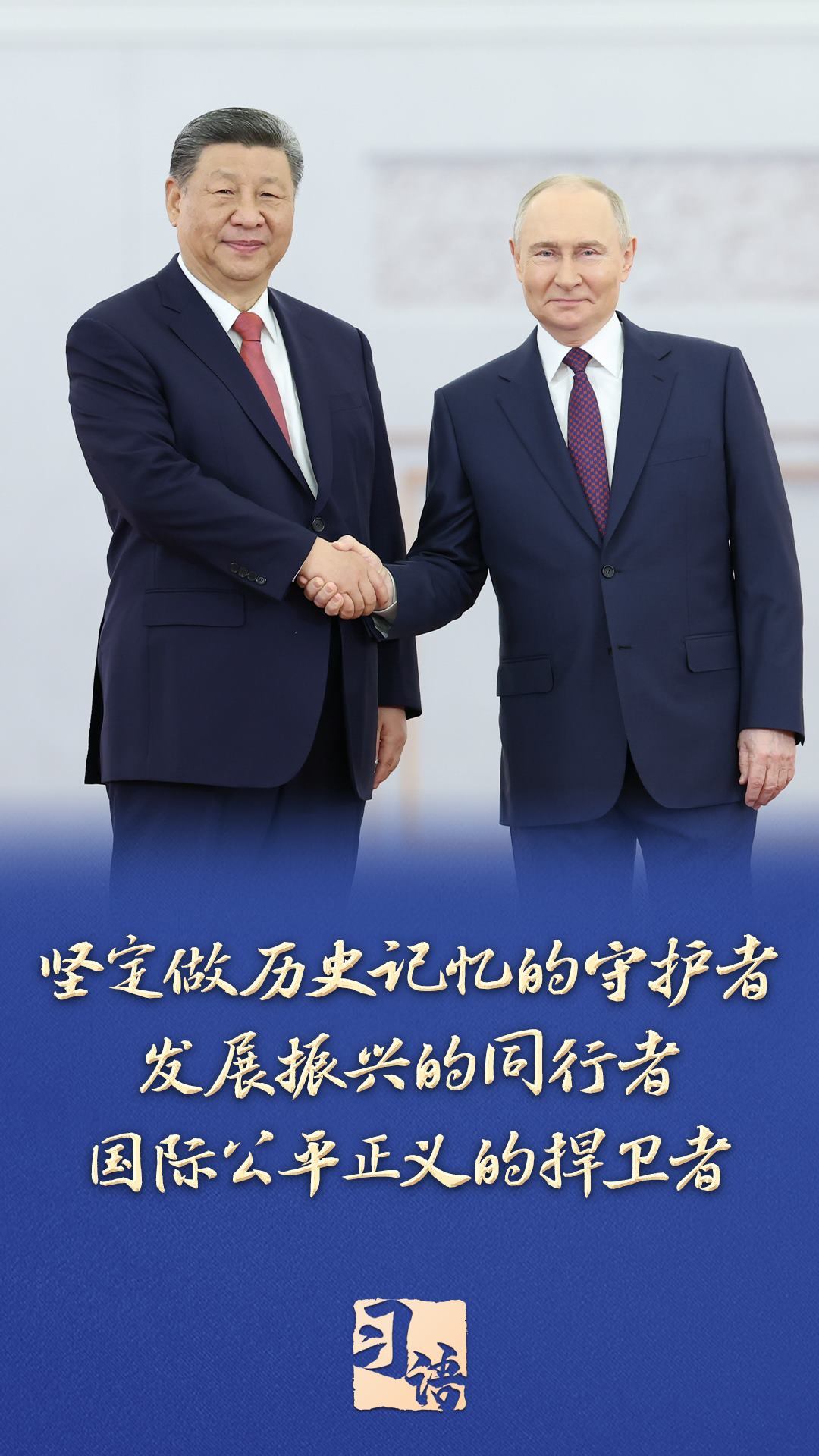 “面對(duì)變亂交織的國際形勢,中俄兩國要堅(jiān)定秉持永久睦鄰友好、全面戰(zhàn)略協(xié)作、互利合作共贏精神,風(fēng)雨同渡、關(guān)山共越,全面提升中俄關(guān)系的高度、維度、韌度,為世界和平和安全注入更多穩(wěn)定性,為全球發(fā)展繁榮提供更強(qiáng)推動(dòng)力?!碑?dāng)?shù)貢r(shí)間5月8日,習(xí)近平在同俄羅斯總統(tǒng)普京共同會(huì)見記者時(shí)指出。