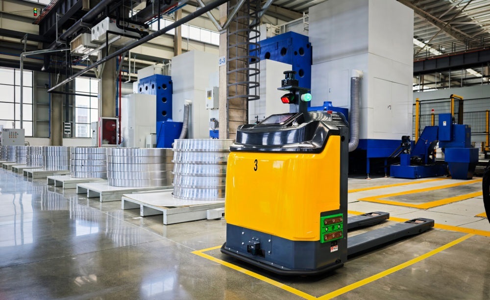 2025年5月19日在洛軸智能工廠拍攝的自動(dòng)導(dǎo)向運(yùn)輸車(chē)(AGV)。