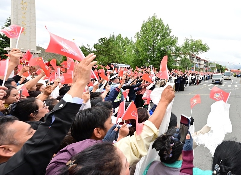 8月20日中午,中共中央總書記、國家主席、中央軍委主席習(xí)近平率中央代表團乘專機抵達拉薩,出席西藏自治區(qū)成立60周年慶?;顒?。習(xí)近平等從機場乘車到住地途中,各族群眾在街道兩旁熱情歡迎。