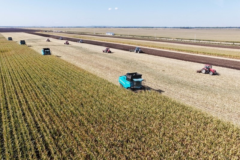 2025年9月23日,在位于雙鴨山市的黑龍江北大荒農(nóng)業(yè)股份有限公司友誼分公司一旱田地塊,大型農(nóng)業(yè)機(jī)械在進(jìn)行玉米收獲作業(yè)(無(wú)人機(jī)照片)。新華社記者 王松 攝