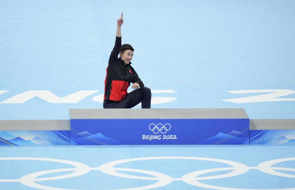 高亭宇比出“第一”的手勢(shì),咧嘴笑了。他高舉五星紅旗環(huán)繞全場(chǎng),朝觀眾席大喊了一聲,宣泄心中的激情?!拔覑?ài)你中國(guó),親愛(ài)的母親……”音樂(lè)響起,亮麗的中國(guó)紅在“冰絲帶”飄揚(yáng)。