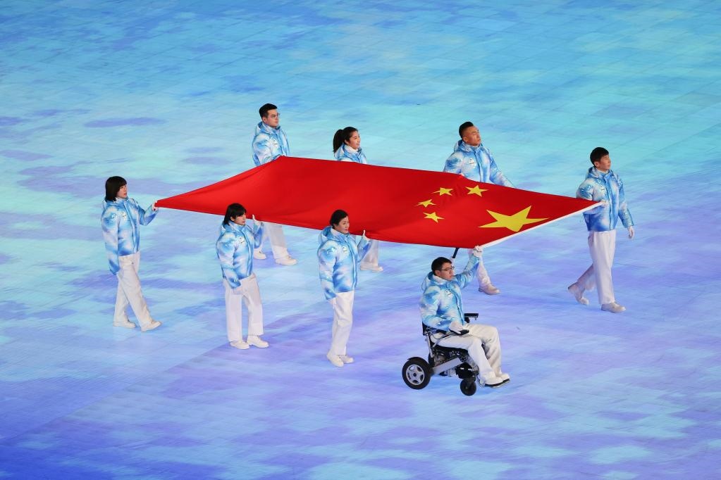 3月4日晚,北京2022年冬殘奧會(huì)開(kāi)幕式在北京國(guó)家體育場(chǎng)舉行。這是中華人民共和國(guó)國(guó)旗入場(chǎng)。新華社記者 馬希平 攝