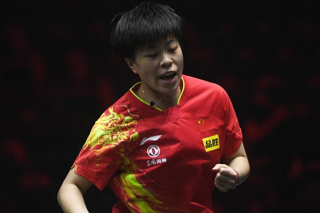 3月17日,中國選手王藝迪在女單四分之一決賽比賽中慶祝得分。