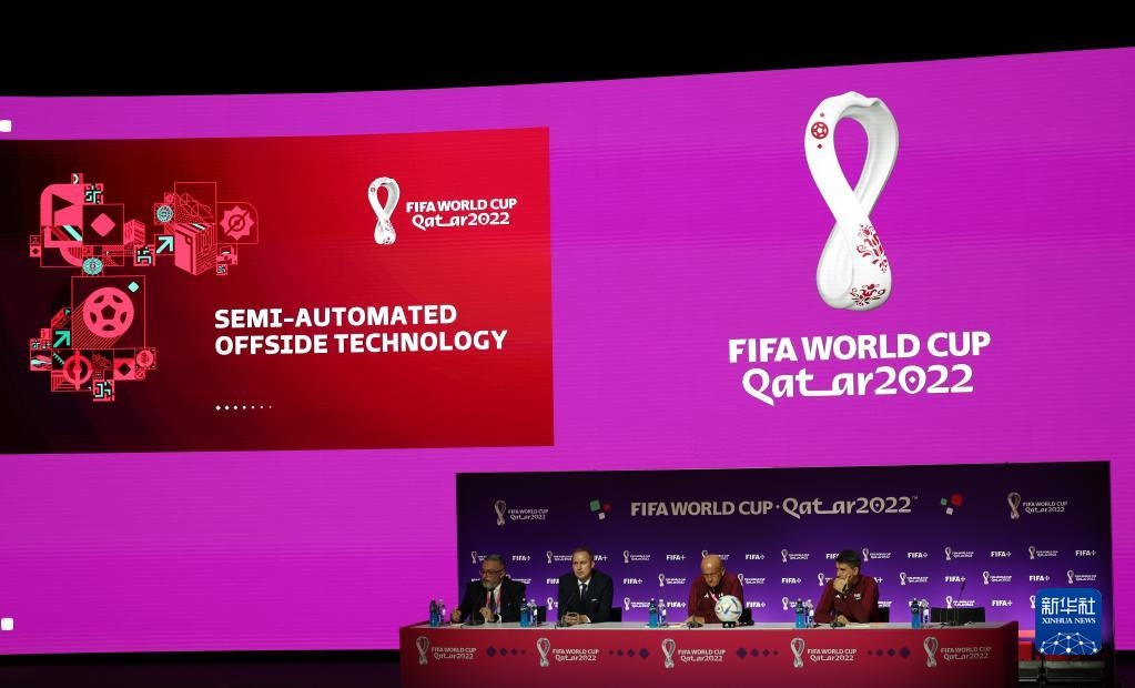 11月18日,國際足聯(lián)足球技術與創(chuàng)新總監(jiān)霍爾茲穆勒(左二)在通氣會上介紹半自動越位識別技術。新華社記者 賈浩成 攝