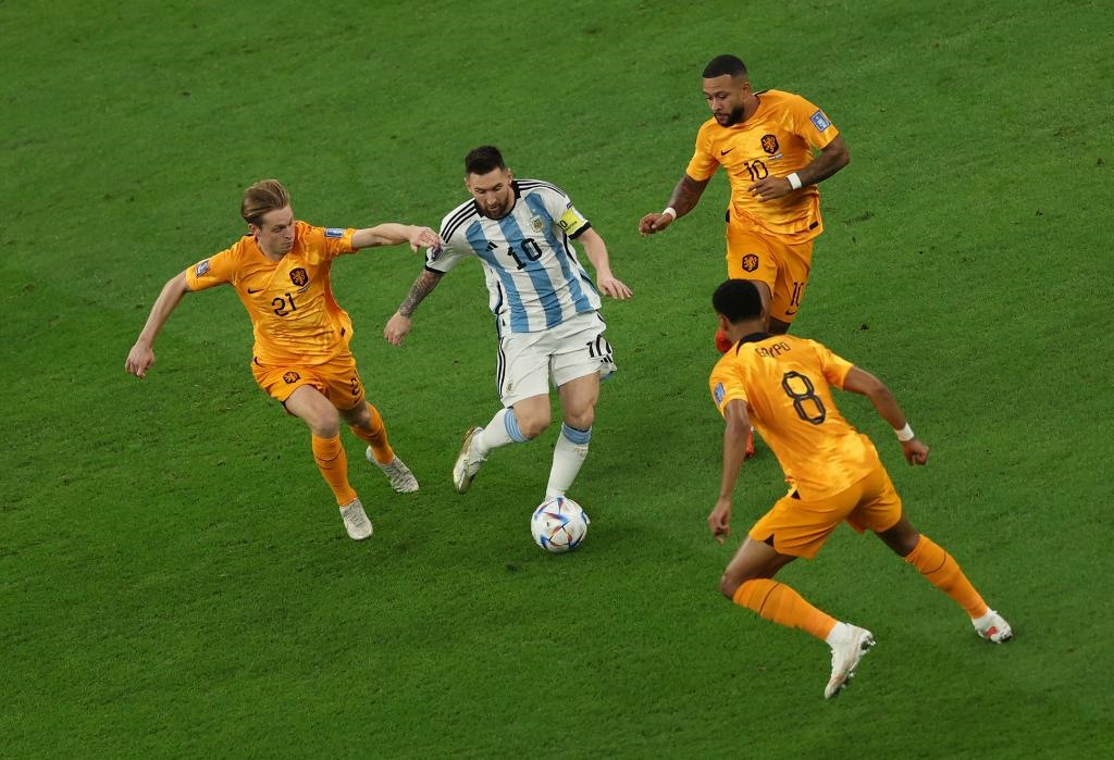 12月9日,阿根廷隊(duì)球員梅西(左二)在對荷蘭隊(duì)的比賽中進(jìn)攻。新華社記者 潘昱龍 攝