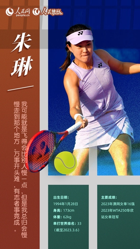今年年初,29歲的朱琳給自己定了新賽季兩個目標:拿一個WTA巡回賽單打冠軍、世界排名進入前50位。朱琳在澳網(wǎng)接連戰(zhàn)勝多位好手,首次闖進大滿貫女單16強。2月5日,在WTA華欣站女單決賽中,朱琳戰(zhàn)勝烏克蘭選手特蘇倫科,獲得職業(yè)生涯首個WTA女單冠軍,同時世界排名上升至41位,創(chuàng)造個人最佳成績。僅用了一個月,她就實現(xiàn)了年初制定的目標。上周,朱琳打進WTA250蒙特雷站4強,將排名提升至第33位,再創(chuàng)個人新高。相信在未來的賽場上,“大器晚成”的朱琳還將創(chuàng)造更多的驚喜。