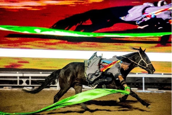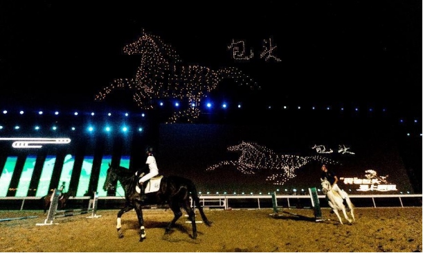 開幕式文體表演由《馬術方陣一馬當先》、歌伴舞《我的城我的馬》、《名馬展示策馬揚鞭》、《單馬技巧雙翼神馬》、《馬障礙秀躍馬揚鞭》、《馬術秀人馬合一》、歌伴舞《騎跡包頭》、《無人機秀馬上精彩》八塊內容組成。當晚的賽汗塔拉馬術賽場流光溢彩、氣氛熱烈,場內座無虛席、歡聲雷動。20時30分許,主騎手手持國旗,副騎手手持馬城旗幟,運動員方陣、民族方陣、女騎方陣、馬主方陣入場,騎手們精神飽滿、英姿颯爽,不時揮手致意,現(xiàn)場觀眾用熱烈的掌聲和歡呼聲,歡迎他們的到來。達茂旗9歲賽馬冠軍阿茹樂手持彩旗引出世界名馬亮相,40對人馬合一的“千古馬頌”表演震撼全場,1000架無人機躍然天空,點亮“騎跡包頭 馬上精彩”的字樣……藍天、碧水、凈土的包頭在策馬奔騰的馬術競技中拉開了“中國馬城”的壯麗畫卷。