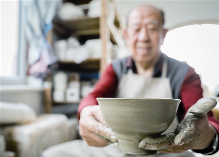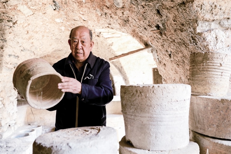隨后,他走進“饅頭窯”旁邊的一口窯洞,這是當時張家的一間手工作坊,揉泥、拉坯、上釉等一系列制作陶瓷的工序都是在這里完成?!拔揖统錾谶@個村子,已經(jīng)是張家瓷藝的第九代傳人了。作為中國磁州窯譜系,清水河黑礬溝瓷藝生產(chǎn)歷史至少已有800年?!标P于這項非遺的歷史故事,張選老人向記者娓娓道來:大約400年前,他們張家走西口從山西來到清水河謀生,當時清水河黑礬溝有一家姓杜的人家做陶瓷營生,張家的先人在杜家打工,大概這樣打工做了三輩人吧,杜家忽然不做了,搬離了黑礬溝,他們張家便把杜家的產(chǎn)業(yè)買了下來繼續(xù)做?!澳莻€時候黑礬溝生產(chǎn)的瓷器都與人們生活息息相關,比如腌菜缸、水甕、碗盤等,一個家庭手工作坊一天能生產(chǎn)500個碗呢,生意很好,人們靠做這個營生也過上了不錯的生活。”張選回憶著清水河瓷藝鼎盛時期的場景。上個世紀70年代,由于交通、技術等原因,黑礬溝燃燒了幾百年的窯火熄滅,傳統(tǒng)“饅頭窯”被正式廢棄,轉(zhuǎn)移到窯溝鄉(xiāng)后手工作坊變成了機械化生產(chǎn),這也讓清水河的陶瓷名聲大噪。當時,在窯溝鄉(xiāng)一帶,從事陶瓷生產(chǎn)的有近萬人,陶瓷業(yè)成為清水河支柱產(chǎn)業(yè)。