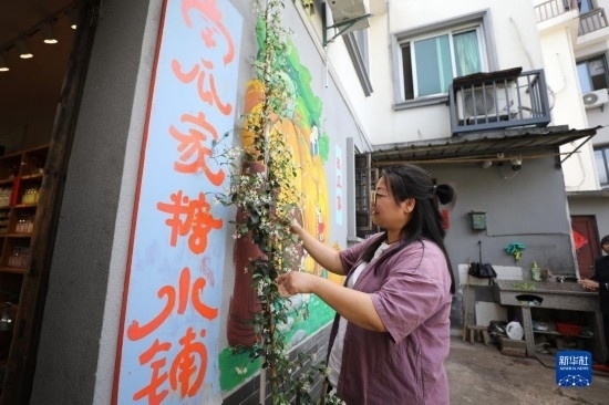 5月23日,在浙江省義烏市李祖村,“南瓜家糖水鋪”的主理人封玲在整理庭院內的植物。