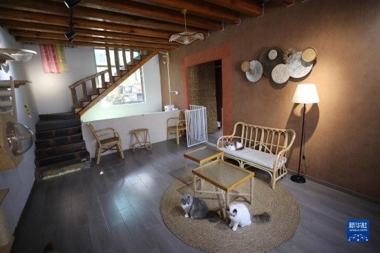 5月23日在浙江省義烏市李祖村拍攝的貓咖“貓的小院”內景。