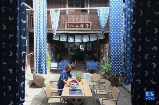 5月23日,在浙江省義烏市李祖村,“沙漠的染坊”主理人的母親在店內整理桌面。
