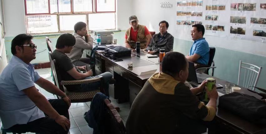 呼和巴特爾(右二)和劇組成員正在討論《片警寶音》拍攝事宜