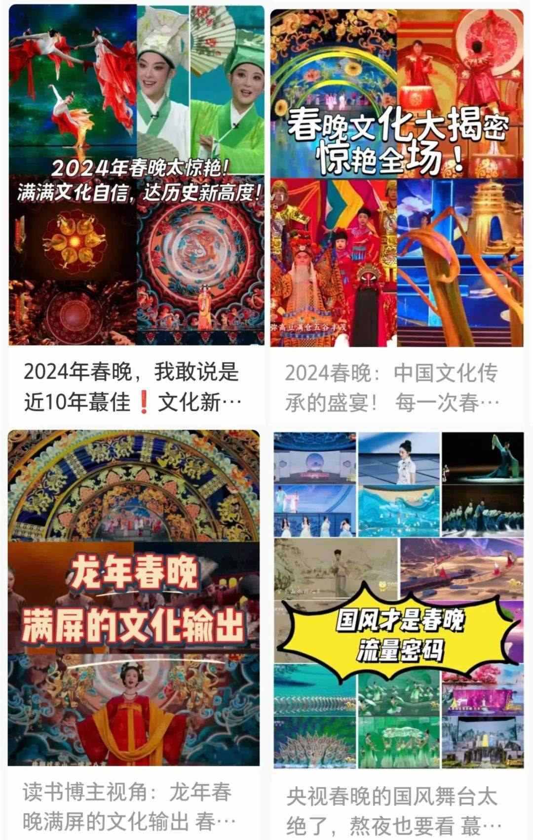 春晚的文化展現(xiàn),在國人中也引起了熱烈反響?!懊恳粋€(gè)文化類節(jié)目都蘊(yùn)含著獨(dú)特的中國之美,這種美有的跨越千年,有的多經(jīng)磨難,春晚給我們呈現(xiàn)了一場場宏大的視聽盛宴,作為觀眾很難不動(dòng)容”“從今年春晚真真切切地感受到了文化自信,大好河山,傳統(tǒng)文化,國家強(qiáng)盛,美美與共”“文化傳統(tǒng)特色給各個(gè)節(jié)目都刷了創(chuàng)意的漆,霸氣從節(jié)目中升騰,自信從感嘆中生發(fā),真妙”......
