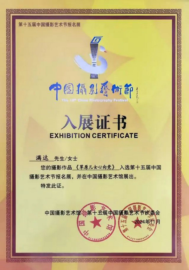 近日,內(nèi)蒙古畫(huà)報(bào)社記者滿達(dá)攝影作品《草原兒女心向黨》入選第十五屆中國(guó)攝影藝術(shù)節(jié)報(bào)名展。