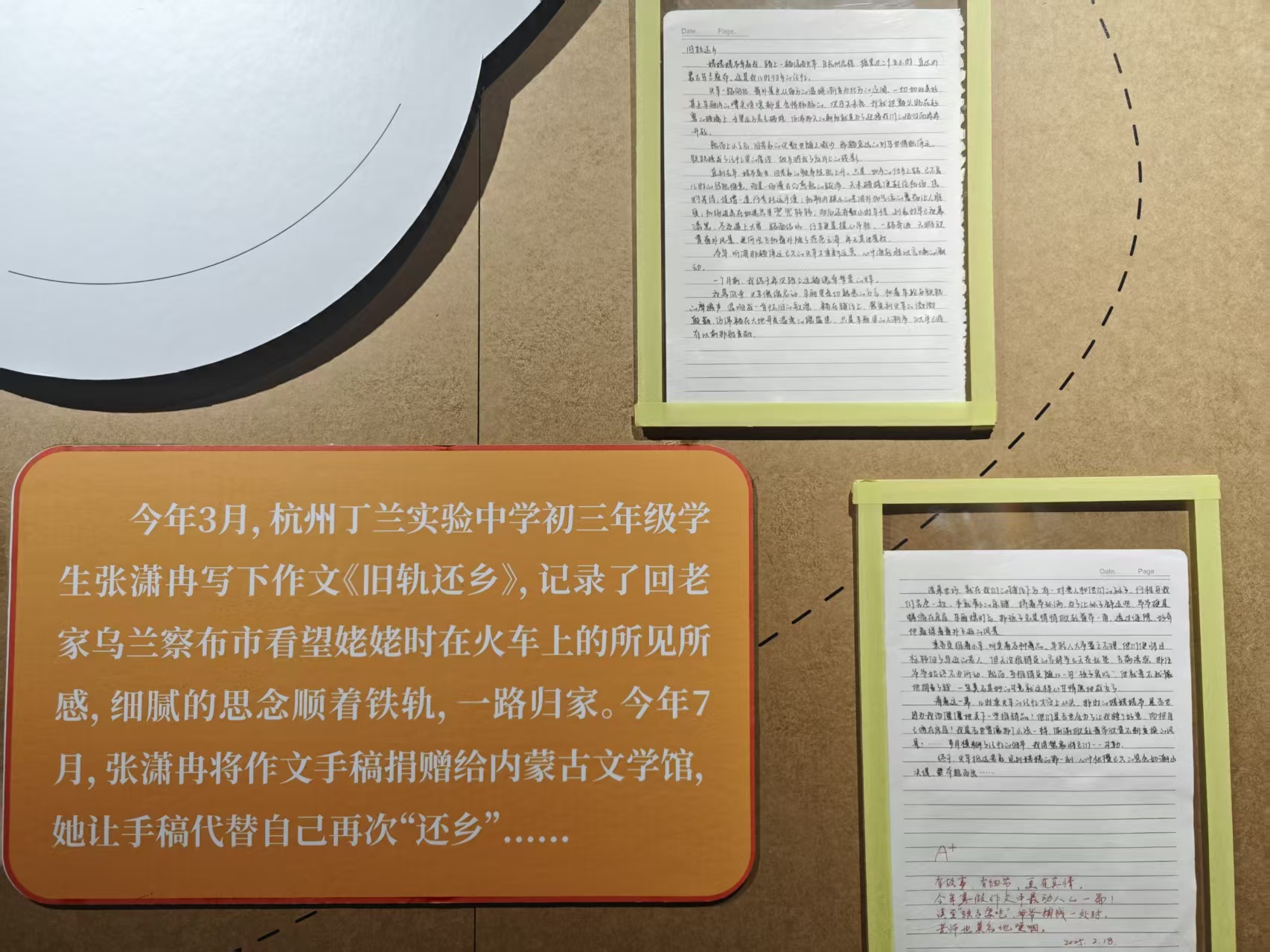 值得一提的是,憑借作文《舊軌還鄉(xiāng)》引起網(wǎng)友廣泛關注和共鳴的內(nèi)蒙古籍女孩張瀟冉,今年7月將手稿捐贈給了內(nèi)蒙古文學館,本次展覽對《舊軌還鄉(xiāng)》手稿進行展出。展覽還展出了生于2007年的少女詩人姜二嫚的詩作,年少成名的姜二嫚用7歲時所作的《光》向全國小詩人們送上問候。