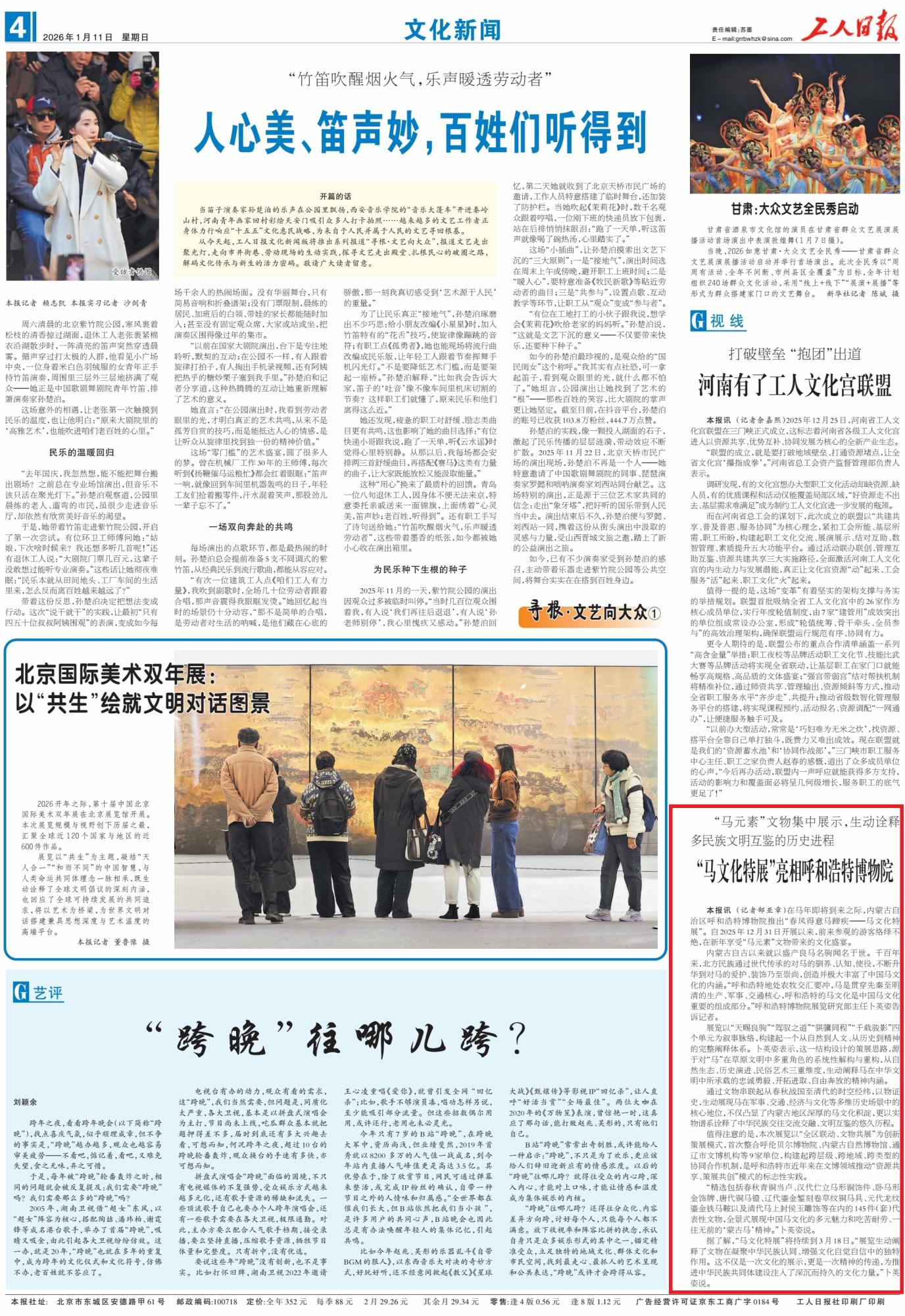 2026年1月11日,《工人日報(bào)》第4版刊發(fā)了《“馬文化特展”亮相呼和浩特博物院》的文章,報(bào)道了馬年即將到來之際,呼和浩特博物院于2025年12月31日推出“春風(fēng)得意馬蹄疾——馬文化特展”,吸引眾多游客前來領(lǐng)略馬元素文物的文化魅力,展覽將持續(xù)至3月18日。