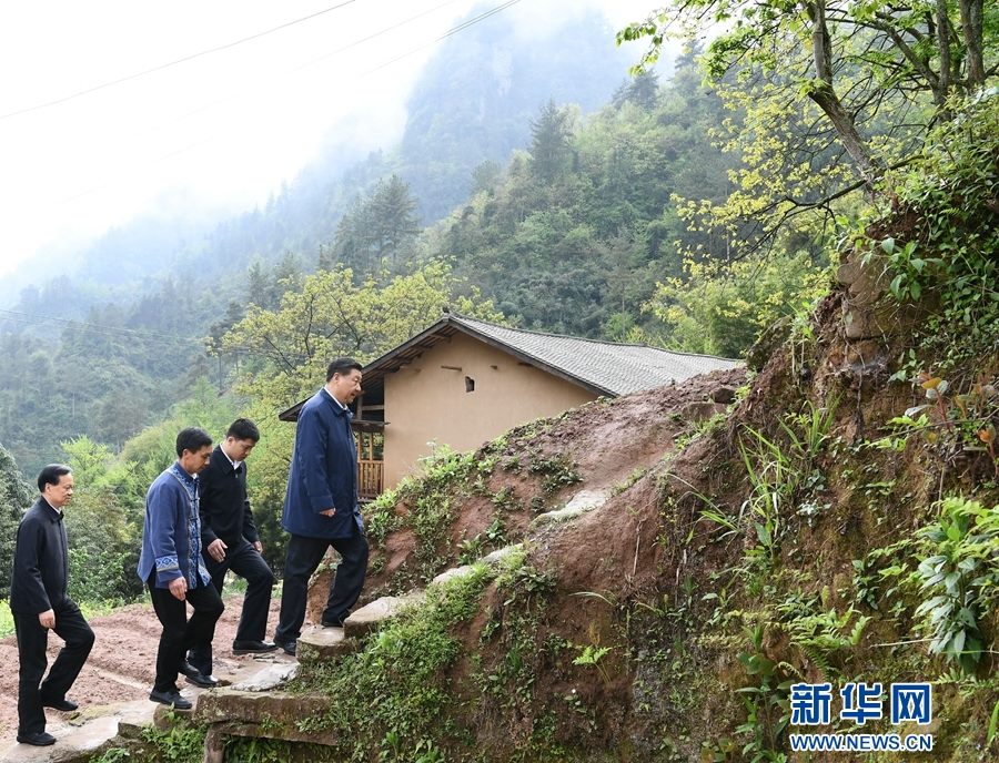 這是4月15日下午,在石柱土家族自治縣中益鄉(xiāng)華溪村,習近平踏著濕滑的石階登上陡坡,前往貧困戶譚登周家看望。 新華社記者 謝環(huán)馳 攝